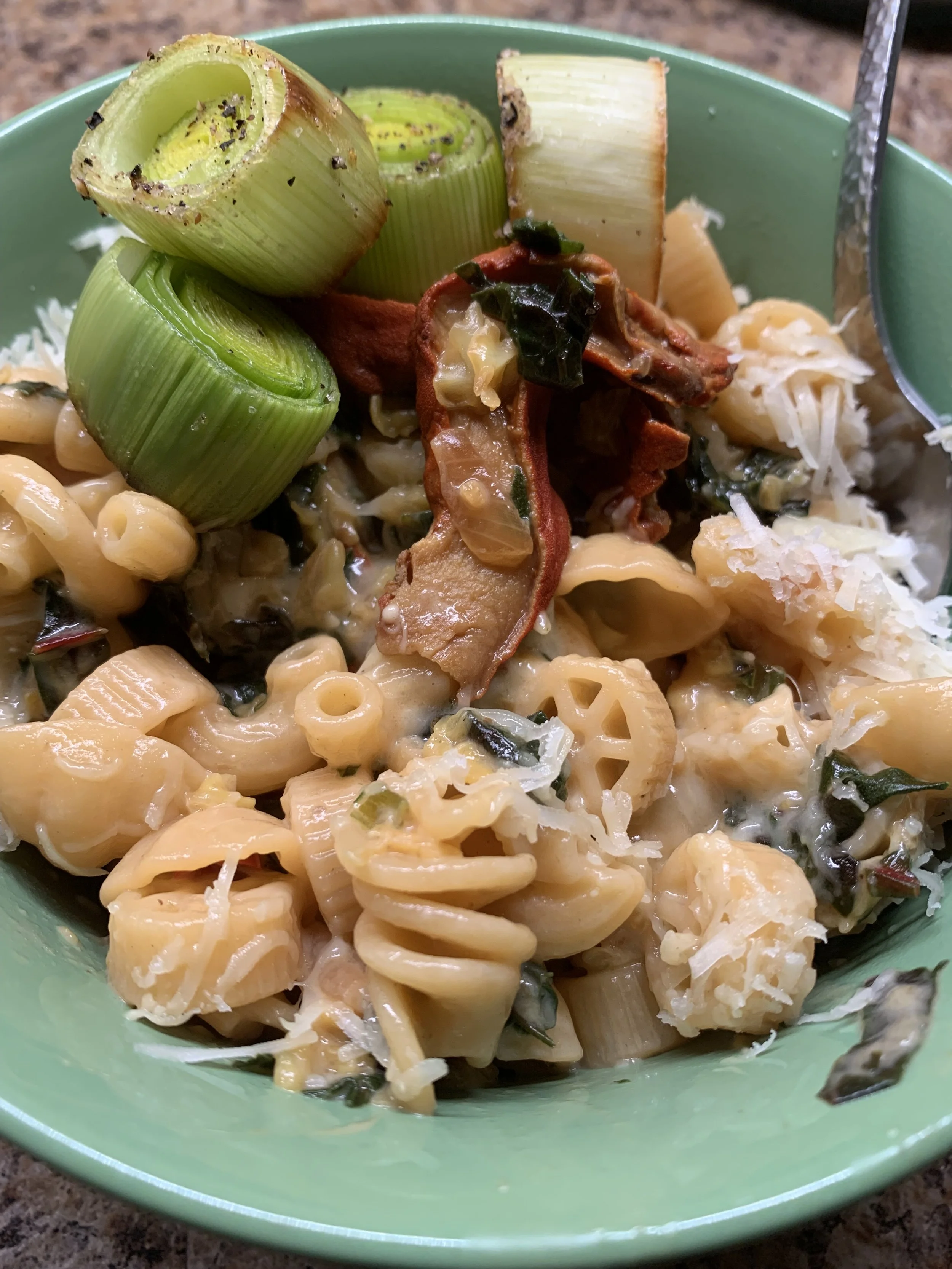 Tender noodles tossed with a medley of sautéed veggies—onions, kale, swiss chard, collard greens, anything green really—infused with garlic and a hint of olive oil. This comforting base is then blended with a rich, creamy combo of Parmesan and Asiago cheese, melting into every bite to create a luscious, cheesy sauce that clings lovingly to each strand. The result is a savory, satisfying dish that feels both indulgent and wholesome, perfect for warming your soul while embracing the goodness of simple, natural ingredients.
